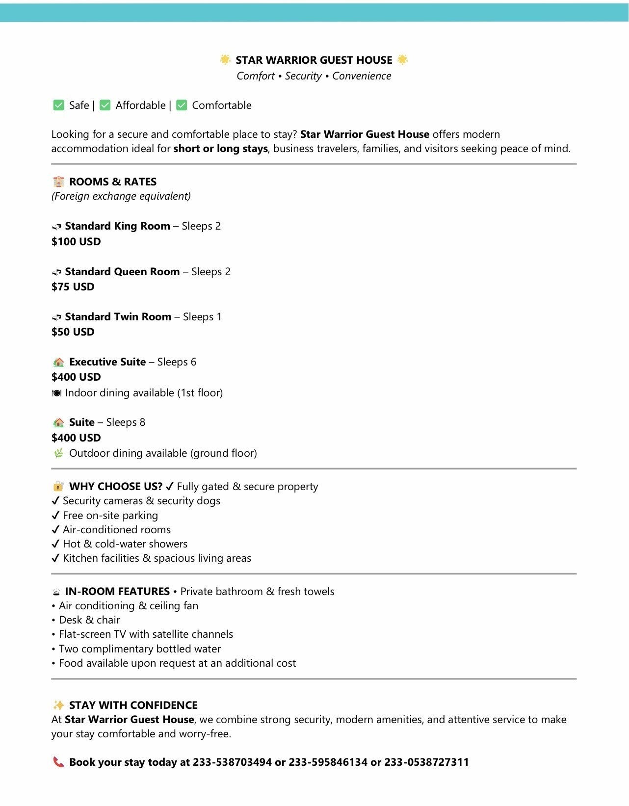 What sets Star Warrior Guest House apart ? It's our unwavering commitment to cleanliness, beautiful furnishings, delightful room scents and impeccable clean beddings. Experience the difference that attention to details make. We are located at Asebu/Pomadze C/G Ghana.